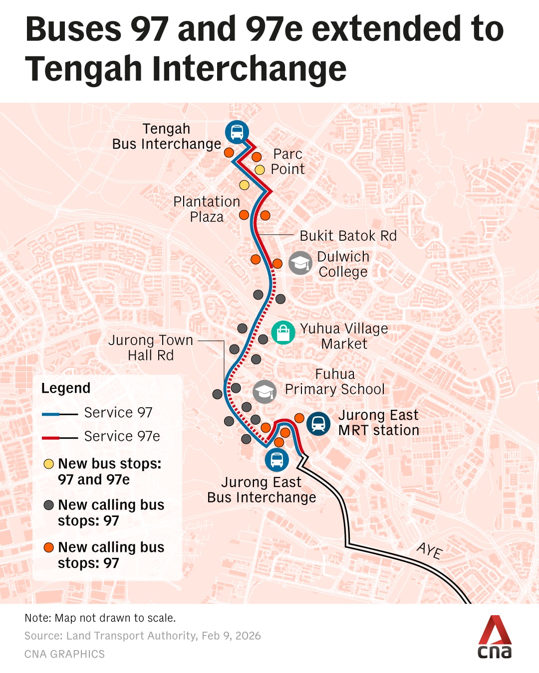 Two existing services – 97 and 97e – will be extended from Jurong East to Tengah on Mar 8, with service 181 to follow in the coming months.