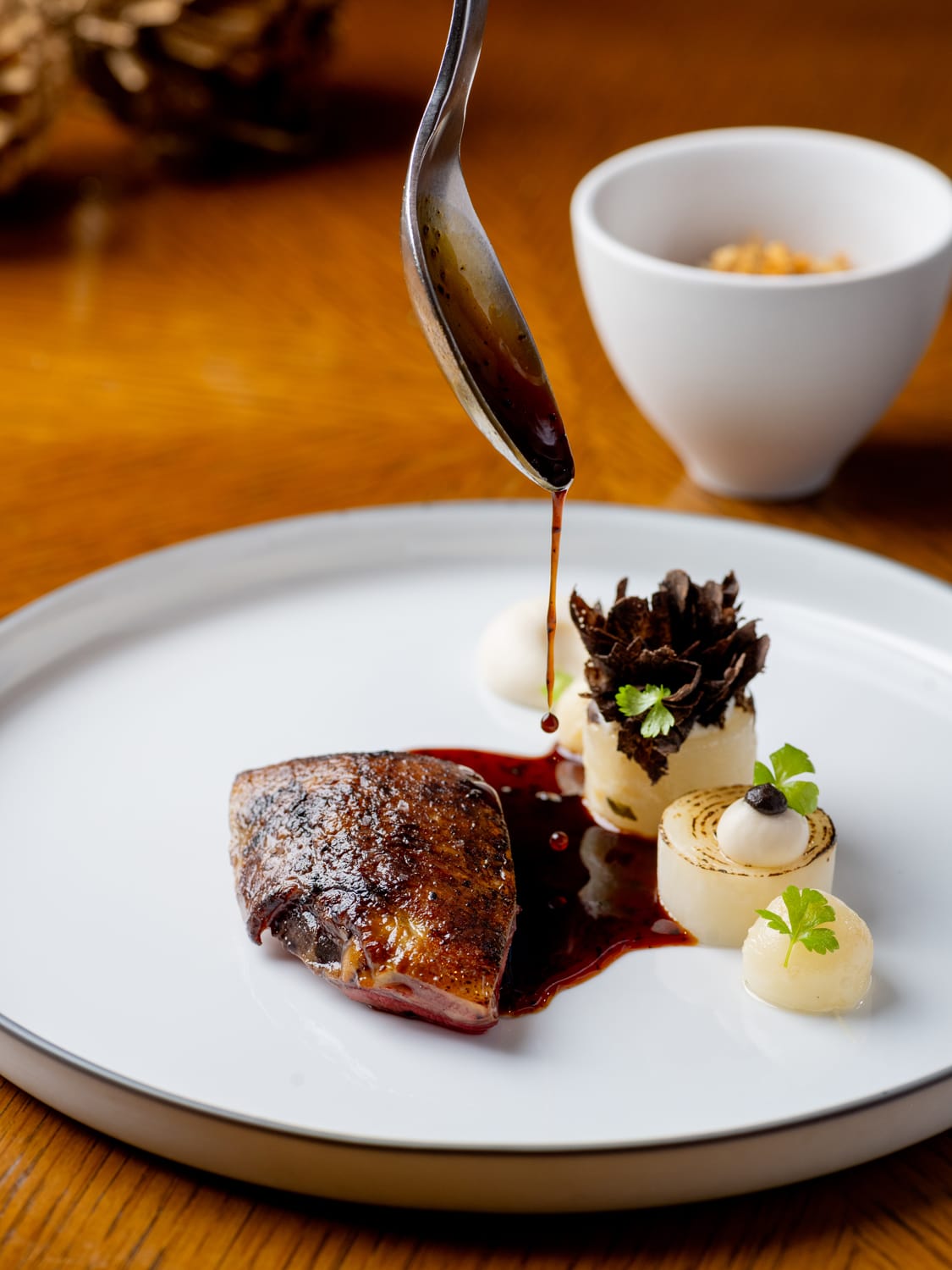 Pigeon ‘Au Sang’ with Himalayan black truffle, celeriac, Granny Smith apple and pigeon ragout. (Photo: Smber)