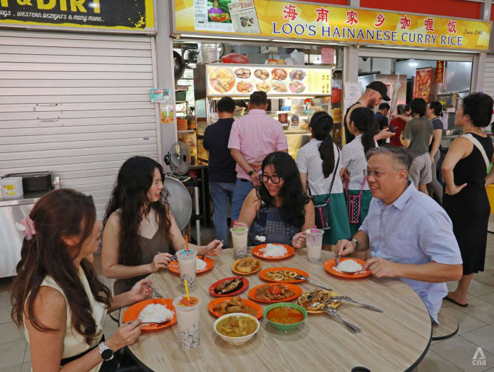 Ms Loraine Lee (seated second from right) having lunch at Loo's Hainanese Curry Rice on Aug 25, 2025 with her sister Laura Lee (second from left) and their parents, Mrs Ruth Lee and Mr Edward Lee. (Photo: CNA/Alyssa Tan)