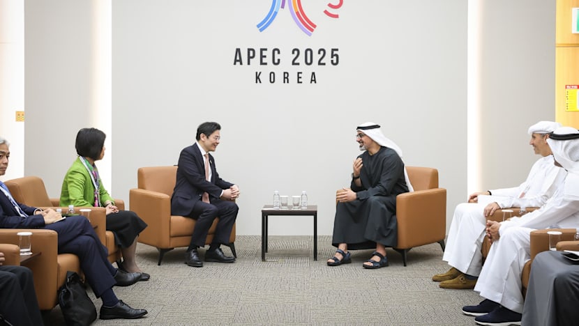 Singapore Prime Minister Lawrence Wong meets Abu Dhabi Crown Prince Sheikh Khaled bin Mohamed bin Zayed Al Nahyan on the sidelines of the 2025 APEC summit in Gyeongju, South Korea, on Oct 31, 2025. (Photo: Ministry of Digital Development and Information)