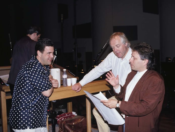 From left: Jonathan Freeman, who voiced Jafar in Disney's Aladdin (1992), songwriter Tim Rice and Alan Menken during the vocal and orchestra pre-recording for the film. (Photo: Disney Theatrical Group)