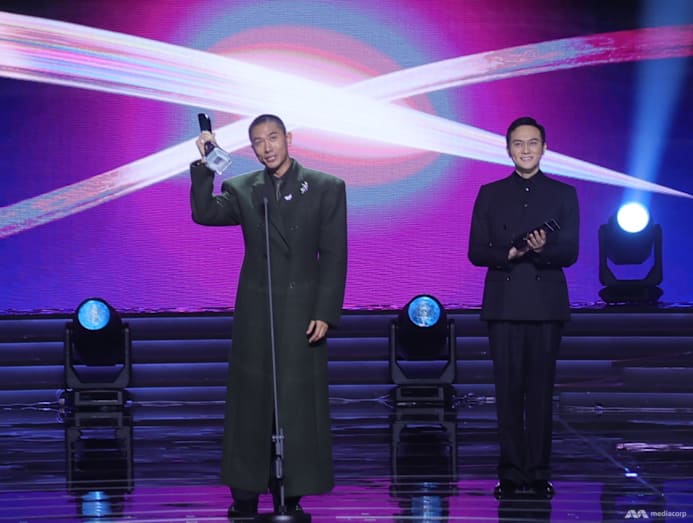 Desmond Tan (left) won Best Actor for his role in Devil Behind The Gate, seen here with Hong Kong singer and actor Julian Cheung at Star Awards 2026. (Photo: Mediacorp)