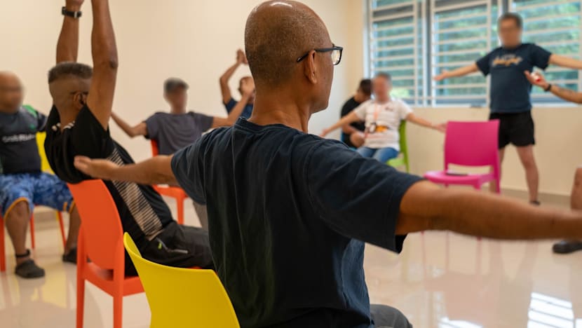 Elderly residents at Selarang Halfway House participate light exercises. (Photo: Singapore Prison Service)
