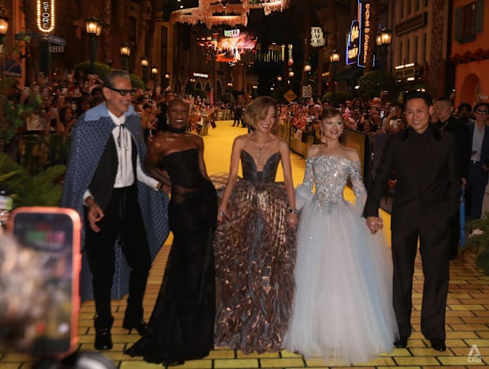 Jeff Goldblum, Cynthia Erivo, Ariana Grande, Michelle Yeoh and Jon M Chu on the “yellow carpet” at Universal Studios Singapore for Wicked: For Good premiere event on Nov 13, 2025. (Photo: CNA/Mak Jia Kee)