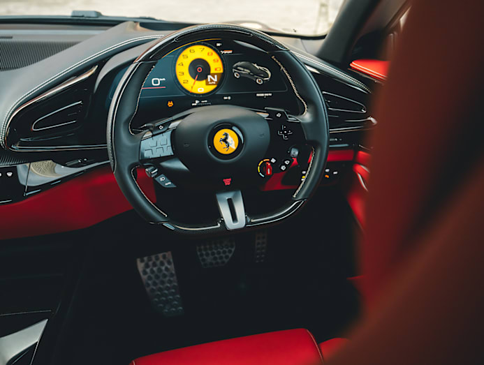 The steering wheel commands numerous controls, including a hidden engine start button, wiper/light switches, and the manettino (small rotary switch) for adjusting chassis settings. (Photo: Ferrari)