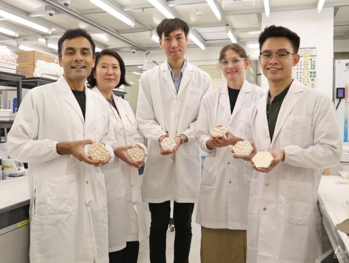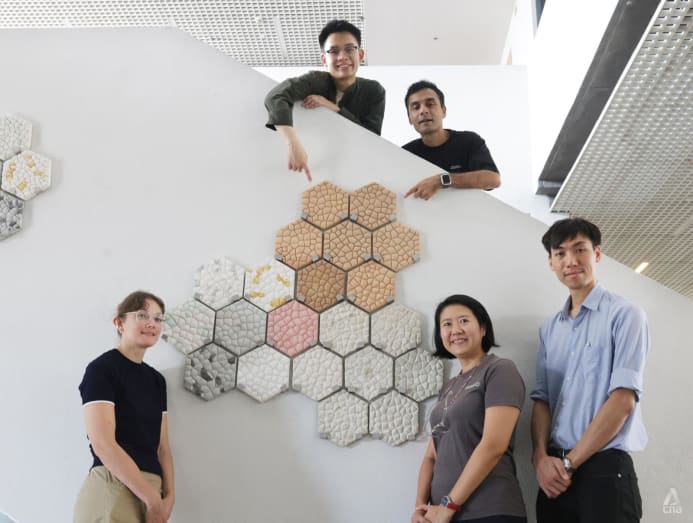 (From left) Dr Anuj Jain from bioSEA; Mykílio's co-founder Beatrice Tan; Dr Teoh Jia Heng; Associate Professor Hortense Le Ferrand; and researcher Eugene Soh from the Nanyang Technological University, pictured with "fungi tiles" that could potentially be used to cool buildings on 25 Aug 2025. (Photo: CNA/Alyssa Tan)