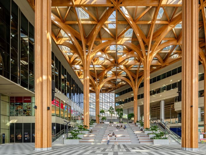 The 3,000-square-metre plaza at Geneo at Science Park 1 is made out of timber, a low-carbon material, and combines shading strategies, greenery and naturally ventilated ground floors to keep visitors cool. (Photo: Capitaland)