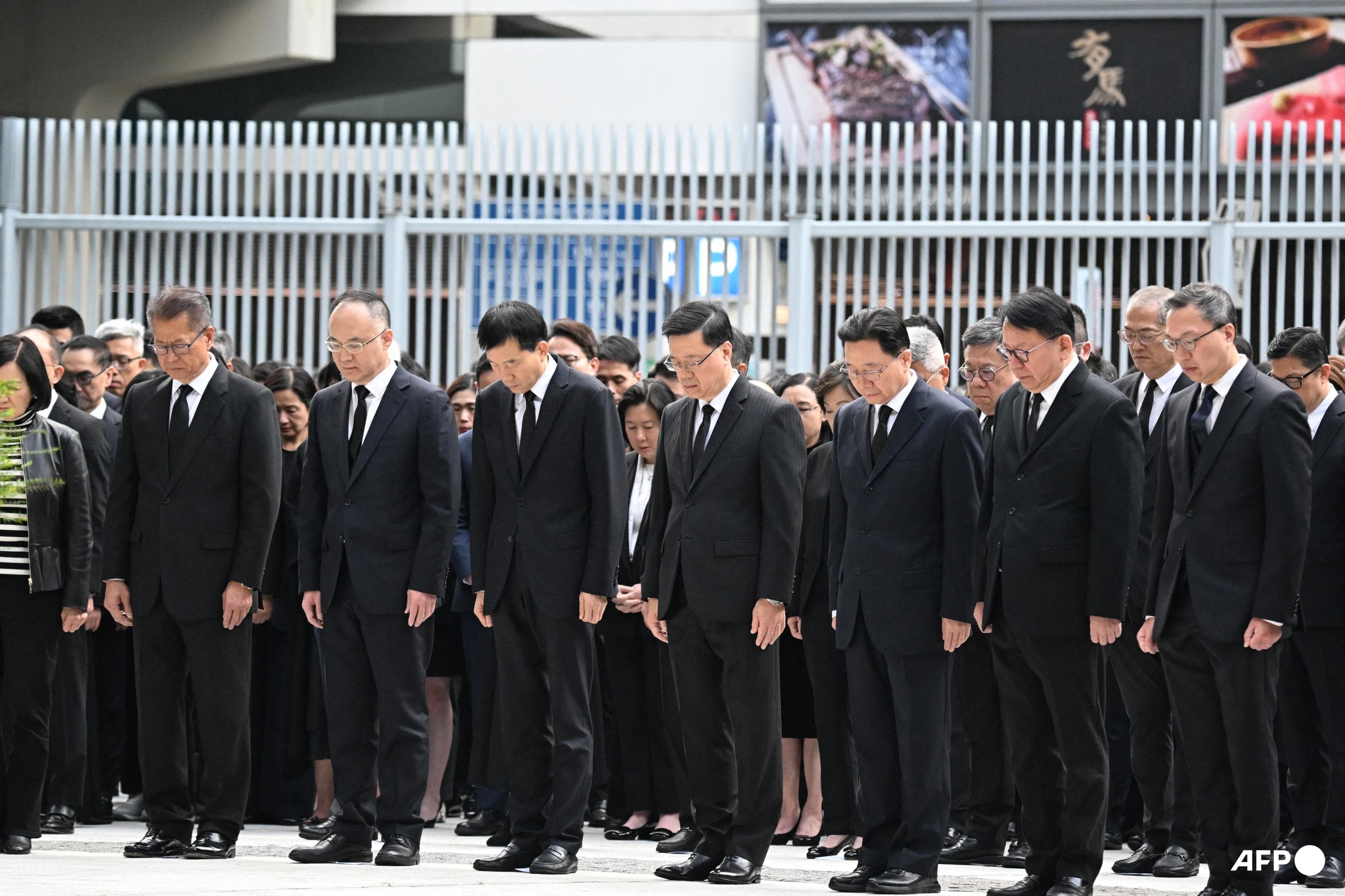 Hong Kong's Chief Executive John Lee (centre) and other government officials observe three minutes of silence to mourn victims of the Wang Fuk Court residential estate fire, at the Central government offices in Hong Kong on Nov 29, 2025. (Photo: AFP/Peter Parks)