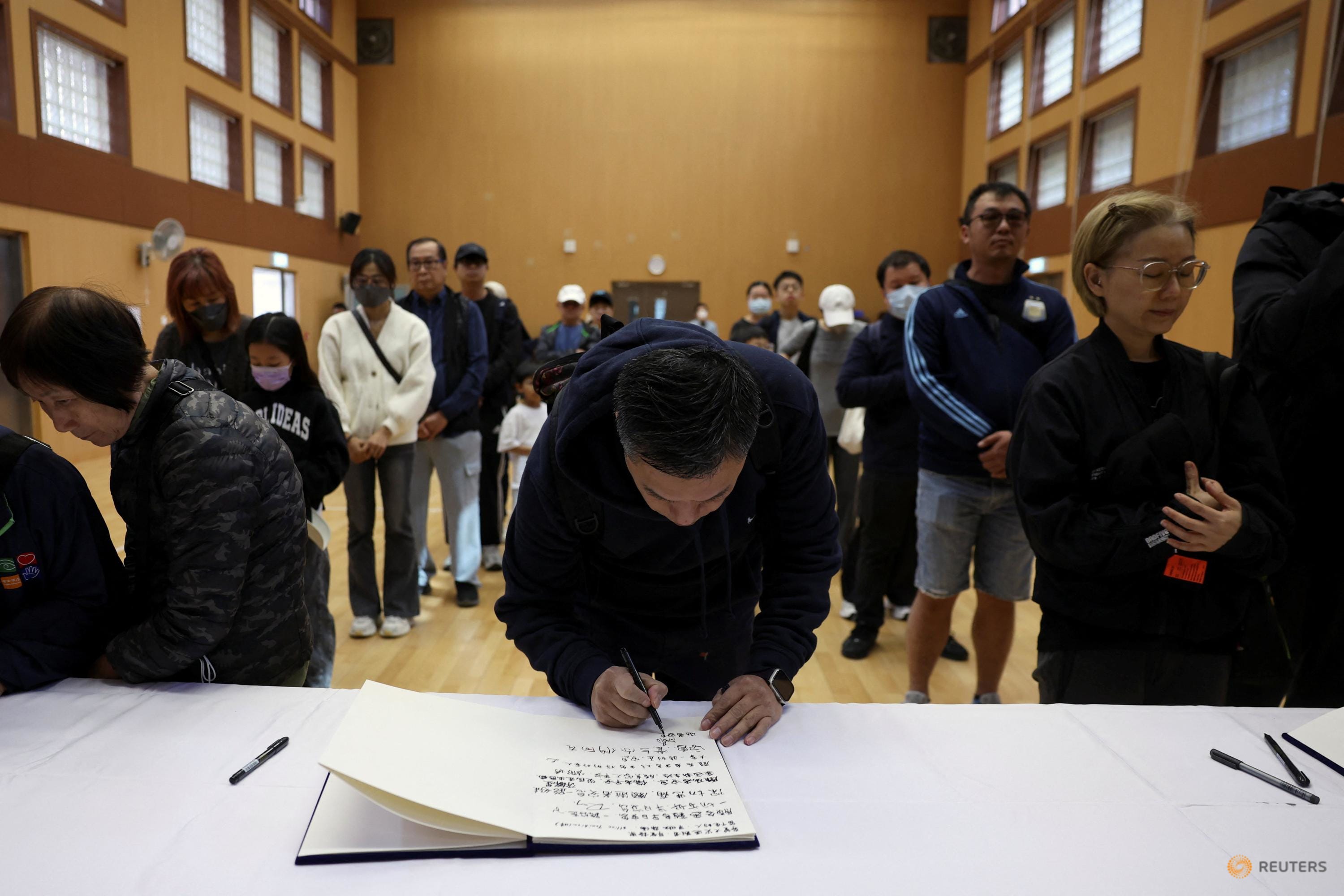 A man writes in a condolence book to mourn for victims of the deadly fire at Wang Fuk Court housing complex, at a community centre in Tai Po, Hong Kong, China on Nov 29, 2025. (Photo: Reuters/Amr Alfiky)