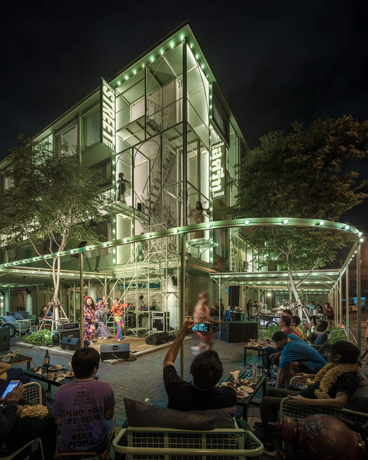 At Samsen, the scaffold design is extended to the front of the hotel onto the lawn, deliberately kept open so that passers-by can look in and guests can hang out and interact with the neighbourhood. On weekends, street concerts are held, with performers standing one on top of the other on the platforms like a vertical stage.