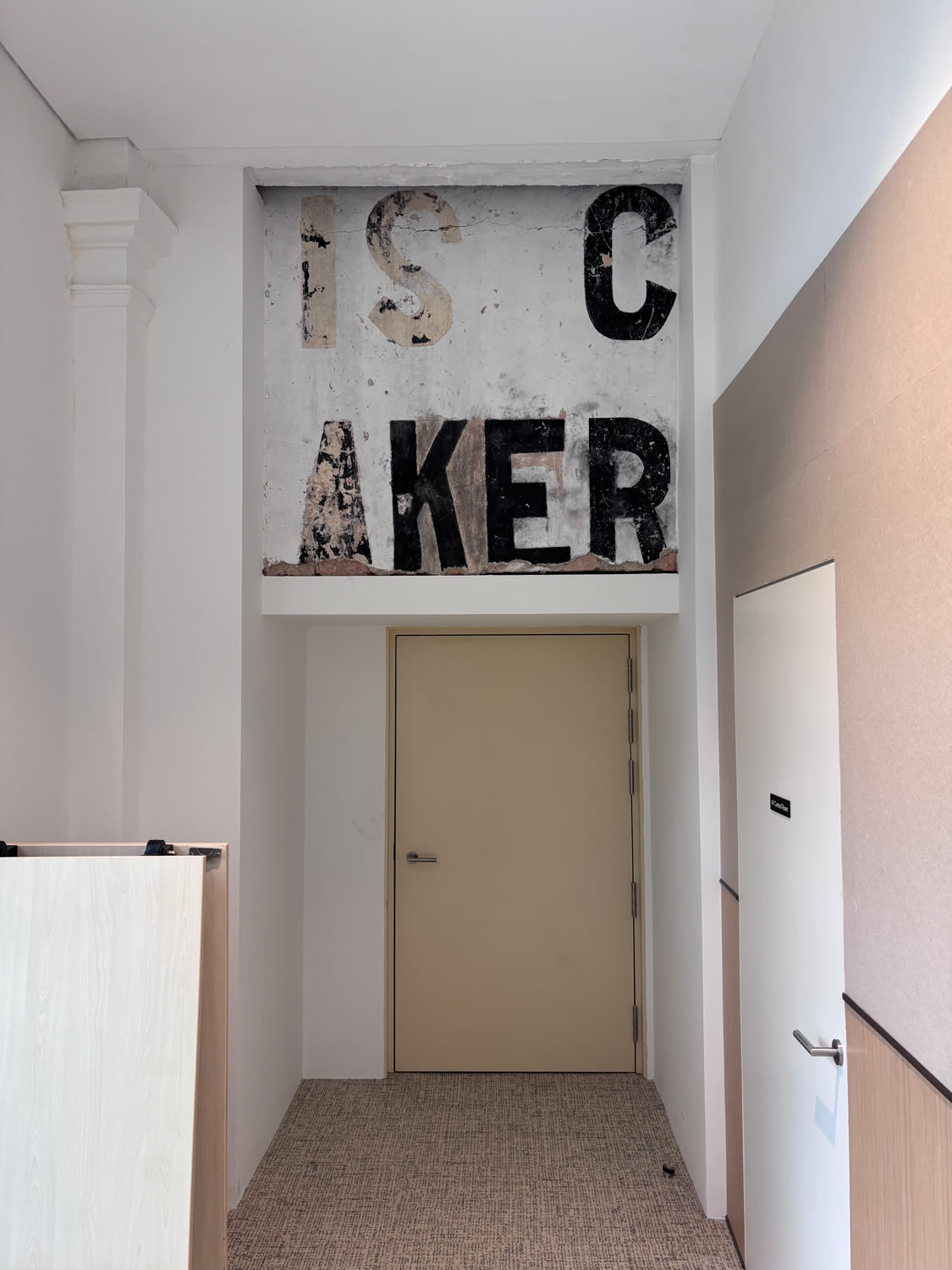 Another ghost sign that has been retained is on the third-floor party wall between numbers 22 and 16. Only a handful of letters on the original signage remain visible: IS, C and AKER. They are part of a painted advertisement that rose above the showroom, when it was only two storeys tall, promoting the Wearne brothers’ Morris and Baker cars. The rest is hidden behind the conserved structural beam and adjacent walls, preserving an evocative connection to the site's automobile past.
