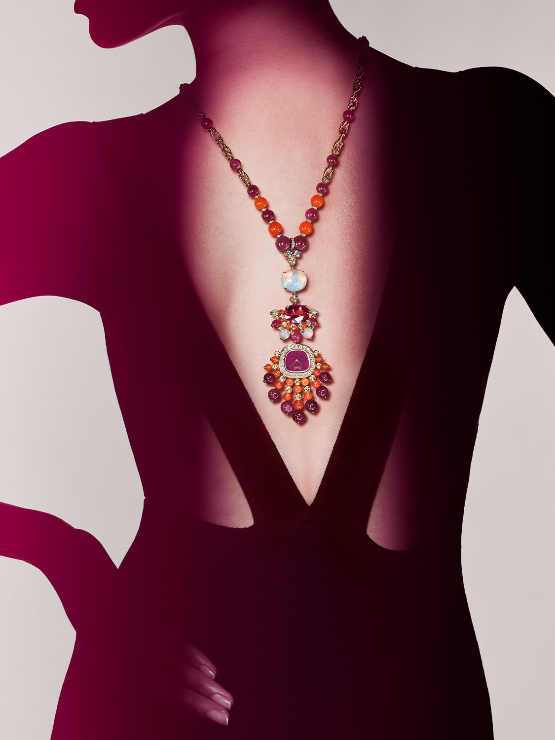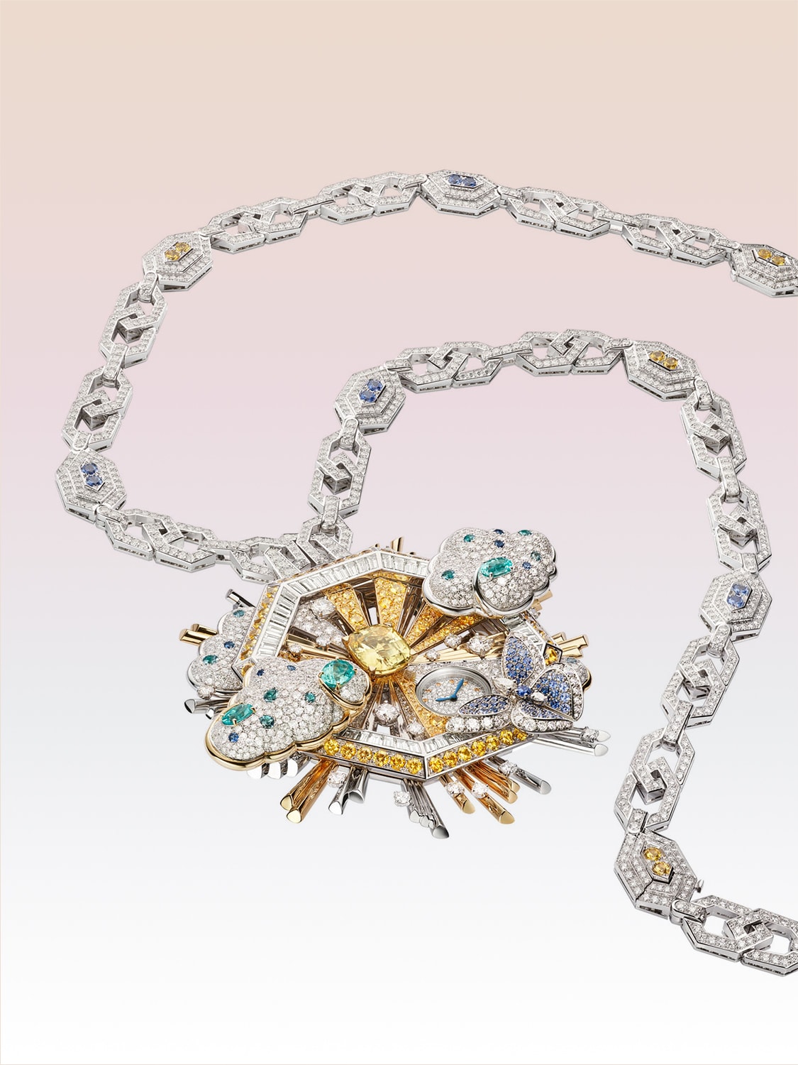 Drawing inspiration from Rome’s architectural grandeur, Bvlgari's Nuvole Preziose Pendant Watch from the Italian jeweller’s Polychroma high jewellery collection transforms timepiece design into wearable poetry. Its octagonal case echoes the coffered ceiling of Rome’s Basilica Maxentius, while its focal point – a breathtaking 6.88-carat certified cushion-cut yellow sapphire – blazes like a shaft of Italian sun.