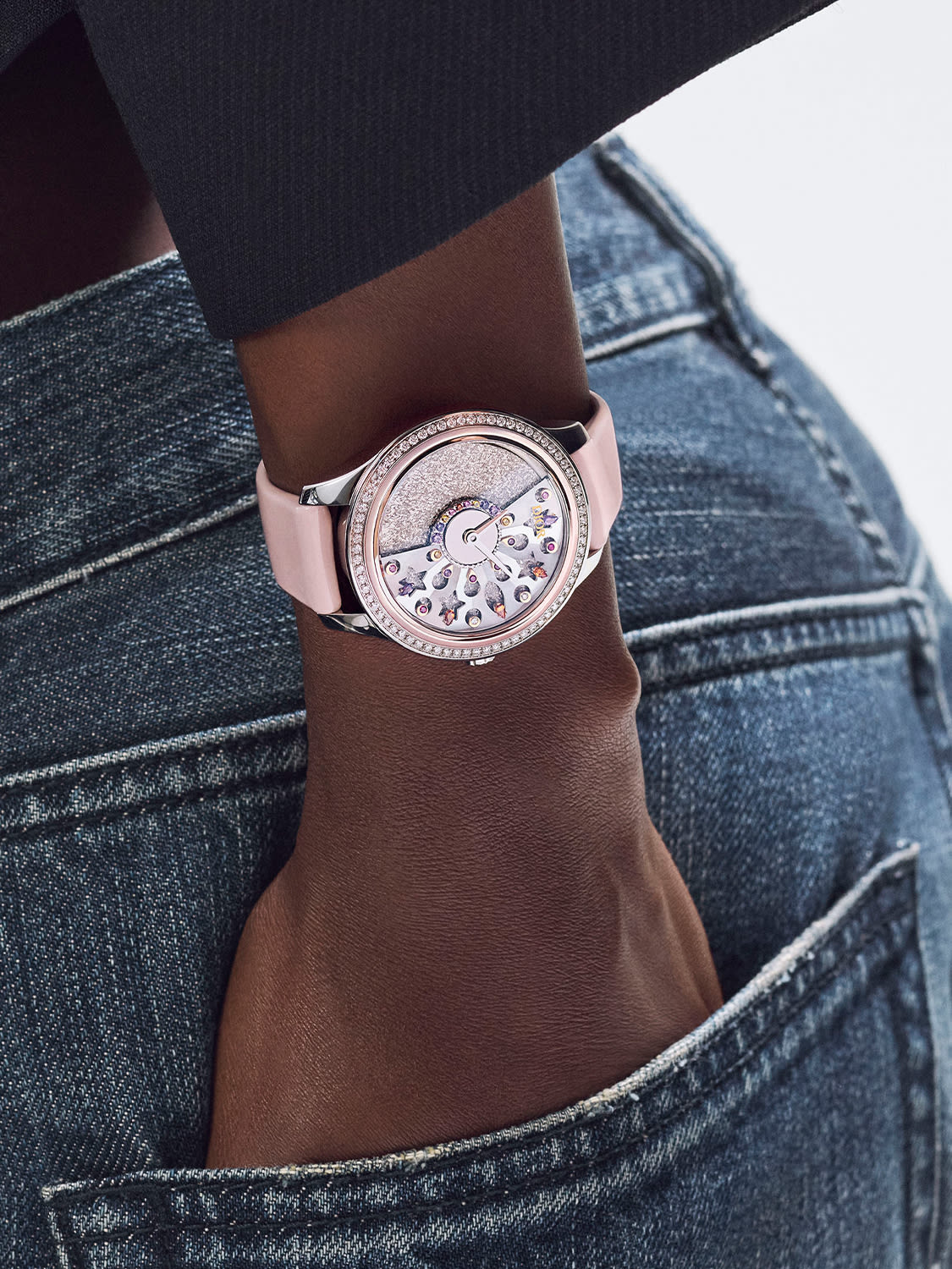 The Swiss quartz-movement watch's theatrical personality emerges through its gem-set carnival of colours. A diamond-set bezel frames a brass dial adorned with a glitter pattern, while the signature Dior Inverse 11 1/2 automatic movement features its oscillating weight front and centre – mimicking a ballgown's graceful swirl when in motion. Here, the openworked gold rotor becomes a stage for precious performers in the guise of diamonds, rubies, amethysts, spessartite garnets and sapphires that pirouette around the dial with every flick of the wrist.