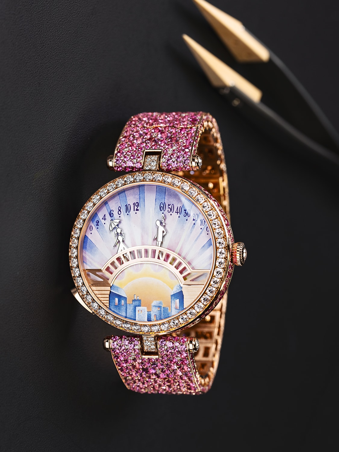 The collection's signature romance unfolds through a double retrograde movement, where two lovers approach each other for a tender kiss at noon and midnight that lasts three magical minutes before separating to mark time anew. An on-demand feature allows wearers to replay this 12-second scene at will, making each timepiece an intimate theatre of affection.