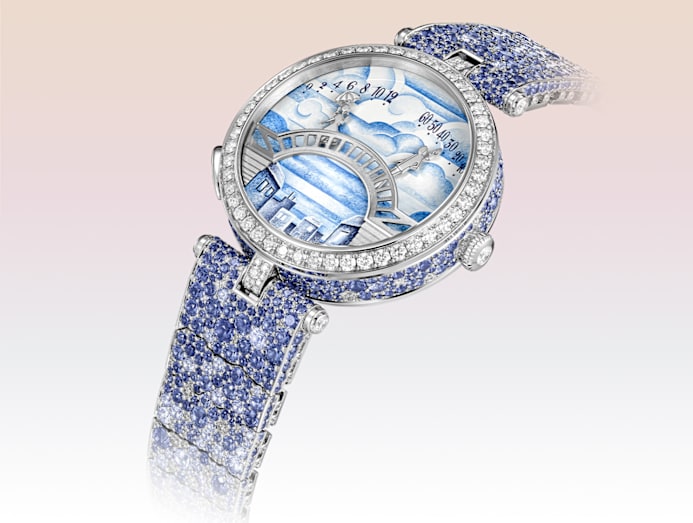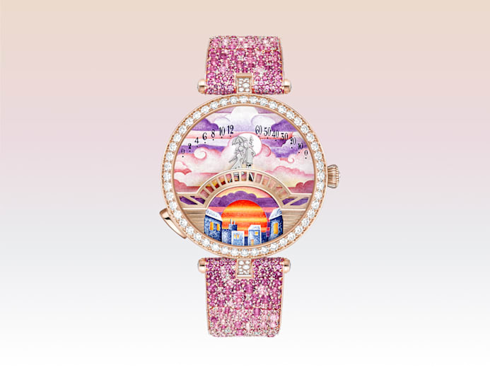 The artistry lies in Van Cleef & Arpels' grisaille enamel technique, applied like delicate watercolour paint in a broad palette reflecting each time period's unique colour nuances. Dawn glows in soft pink hues, morning brightens with cheerful blues, evening deepens into rich purples, while moonlight casts ethereal silver tones. A finely sculpted gold bridge creates dimensional perspective against each beautifully enamelled backdrop.