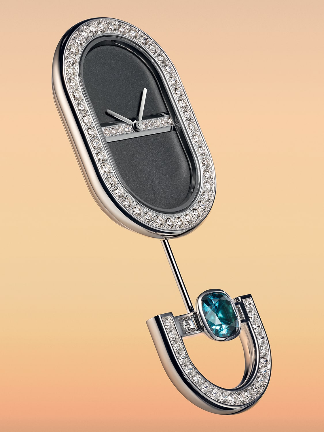 The Maillon Libre brooch watch revives a classic masculine accessory and makes it versatile – wearers can pin it to a jacket lapel or coat sleeve, or opt to slip it onto a black Swift-calfskin cordlet to wear as a pendant. Measuring 35mm by 23mm, its white or rose gold anchor-chain link case is set with brilliant-cut and bead-set diamonds, as well as a bezel-set cushion-shaped main stone – indicolite for the white gold version and terracotta tourmaline for the rose gold model. Additionally, the white gold model is paired with a matte onyx dial, while the rose gold variant flaunts a polished rose gold dial.