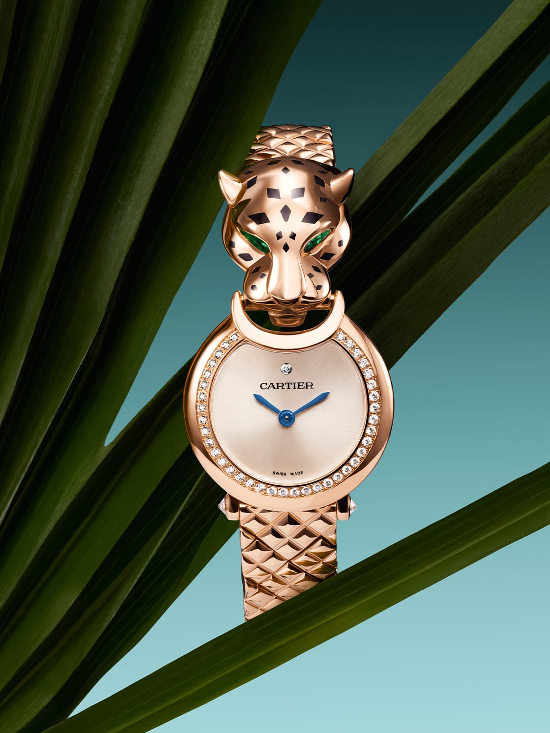 The French maison’s most charismatic muse brings magnetic elegance to the wrist in the form of the La Panthere de Cartier pink gold watch – a sculptural jewel where the feline steals the spotlight. A lacquer-spotted panther grips the dial in its mouth via a polished gold ring, its three-dimensional head modelled with a defined nose, cheeks and pricked ears. Two pear-shaped tsavorite garnets ignite the big cat’s gaze, while 40 brilliant-cut diamonds frame the pink gold dial. Completing the allure is a supple pink gold bracelet that drapes the wrist with effortless grace.