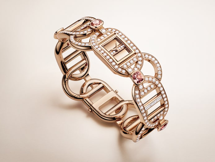 Hermes reframes its anchor-chain link as living jewellery with Maillon Libre, a sculptural timepiece offered in two iterations: A watch and brooch watch. For the wrist, a semi-rigid bracelet in polished white or rose gold flows in undulating links that cradle a discreet dial. Its architecture is enriched by a choice of four bezel-set centre stones – terracotta tourmalines or diamonds – surrounded by settings of brilliant- and baguette-cut diamonds. Powered by a Swiss quartz movement, the Maillon Libre wristwatch features an anchor chain-shaped case measuring 16.5mm by 27.7mm with delicate baton hands.