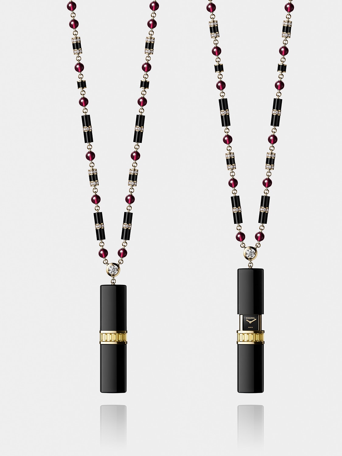 Crafted in glossy black titanium, the square tube pulls open to reveal a precious black lacquered dial resting on a luminous yellow gold ring set with golden beryls. Suspended from an opulent yellow gold chain threaded with mini onyx tubes and rhodolite beads, the pendant is topped with a central 0.7-carat diamond. In total, the piece dazzles with over 100 carats of rhodolites, 20 baguette-cut beryls, and 144 brilliant-cut diamonds totalling nearly six carats. Seamlessly bridging beauty and watchmaking, “Kiss Me” elevates the secret watch from playful conceit to a high-jewellery statement that is whimsical, precious and unmistakably Chanel.