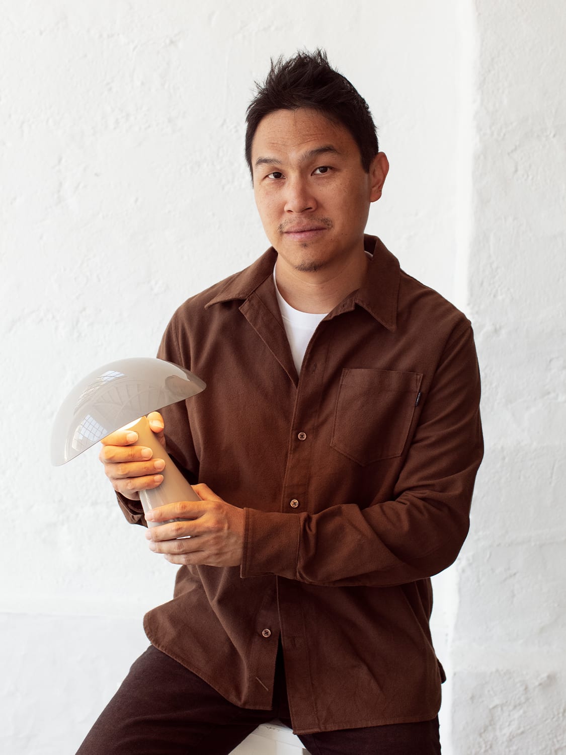 Gabriel Tan and the Rumee lamp he designed for Louis Poulsen. The lamp comes with a diffuser for glare-free lighting, and can be used indoors and outdoors. (Photo: Louis Poulsen)