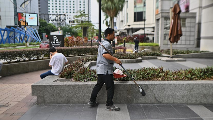A worker cleans litter near a mall in the city centre of Johor Bahru on Jan 8, 2026. (Photo: CNA/Zamzahuri Abas)