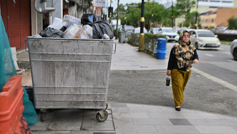 A woman walks past an overflowing rubbish bin in Johor Bahru city centre on Jan 8, 2026. (Photo: CNA/Zamzahuri Abas)