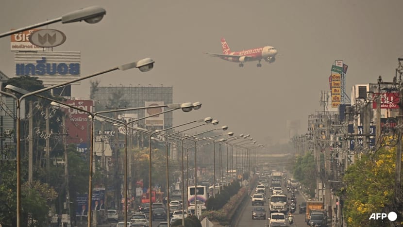An Air Asia plane descends towards Chiang Mai International Airport amid high levels of air pollution in Chiang Mai on Apr 10, 2023. (Photo: AFP/Lillian Suwanrumpha)