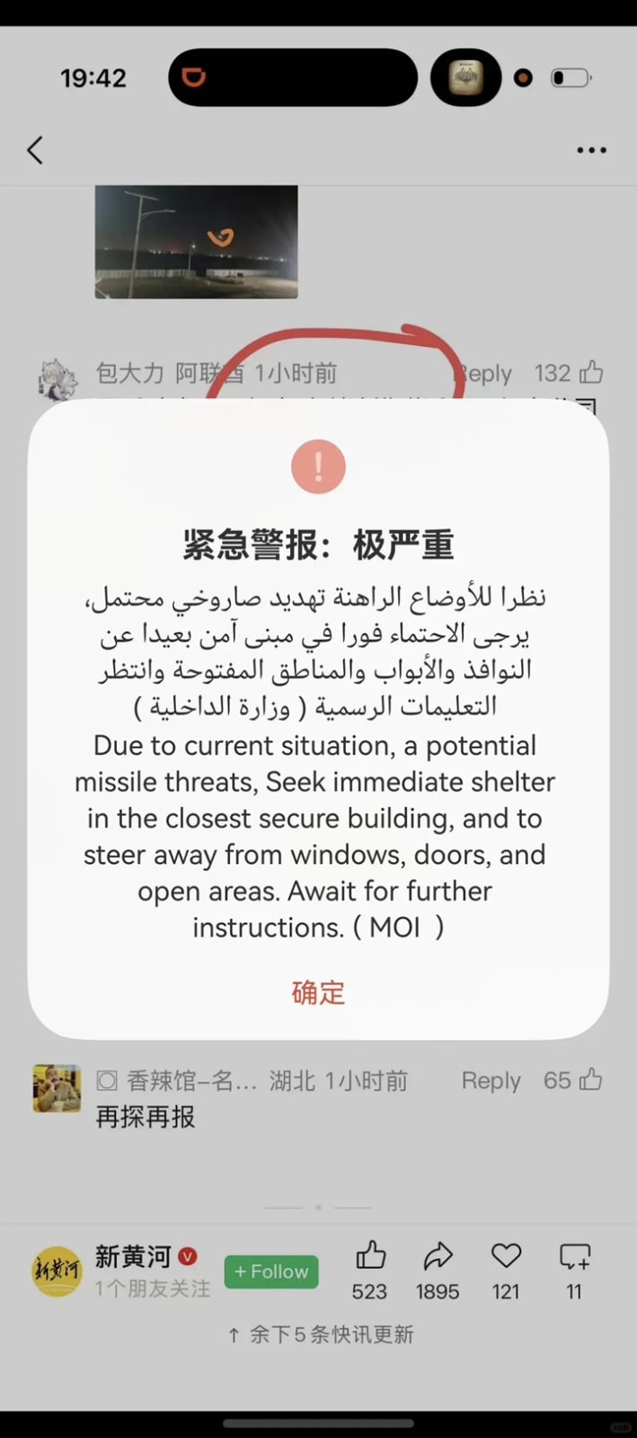 A screengrab of a missile strike alert from the United Arab Emirates' interior ministry. (Image: Xiaohongshu/Mu Rou)