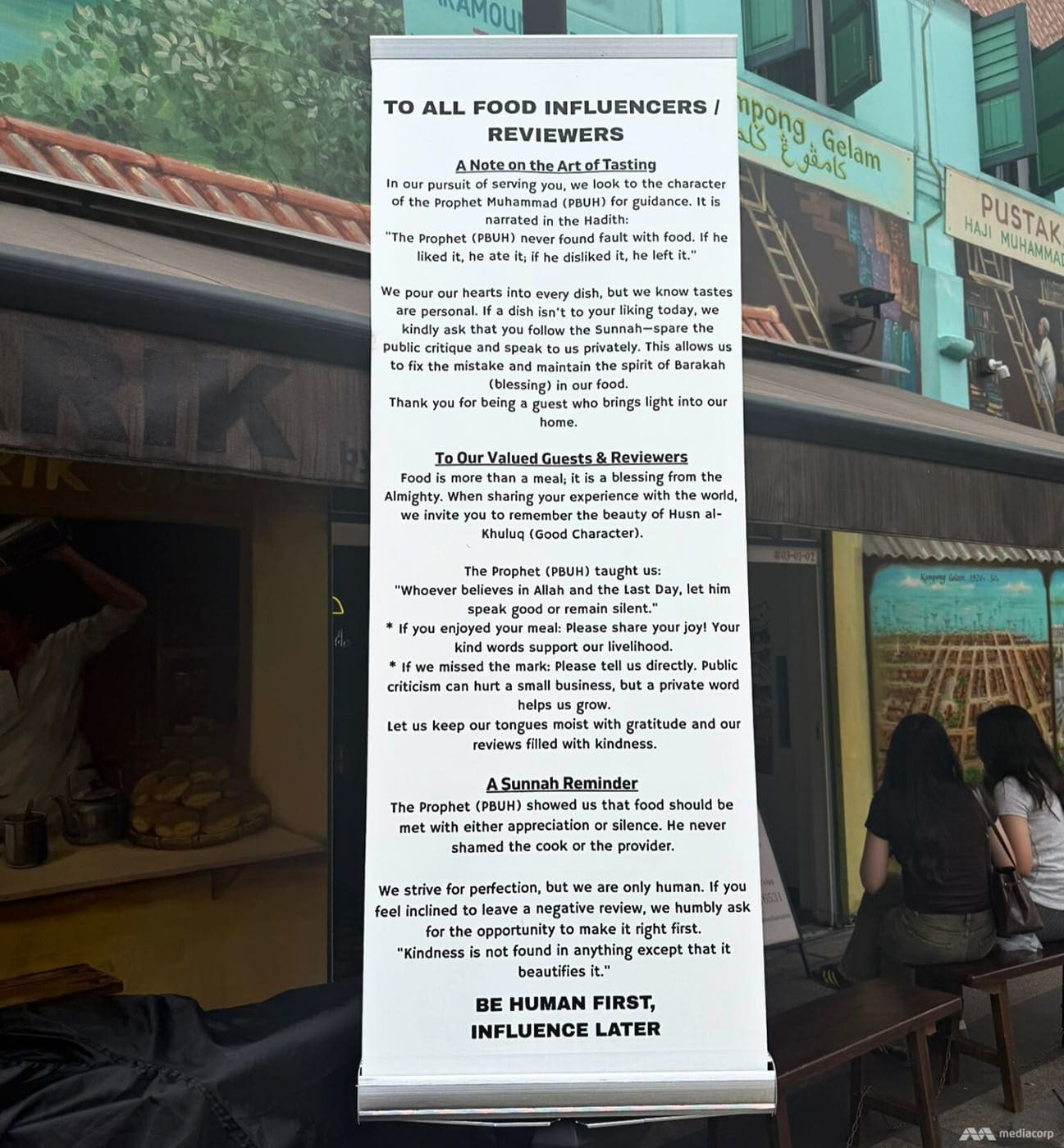 Sheikh Ali Redha, the owner of the popular Kampong Glam tea shop Tarik, had put up the now-viral banner during Ramadan to “spread positivity” after observing “wars” between influencers who post negative food reviews and stall vendors.