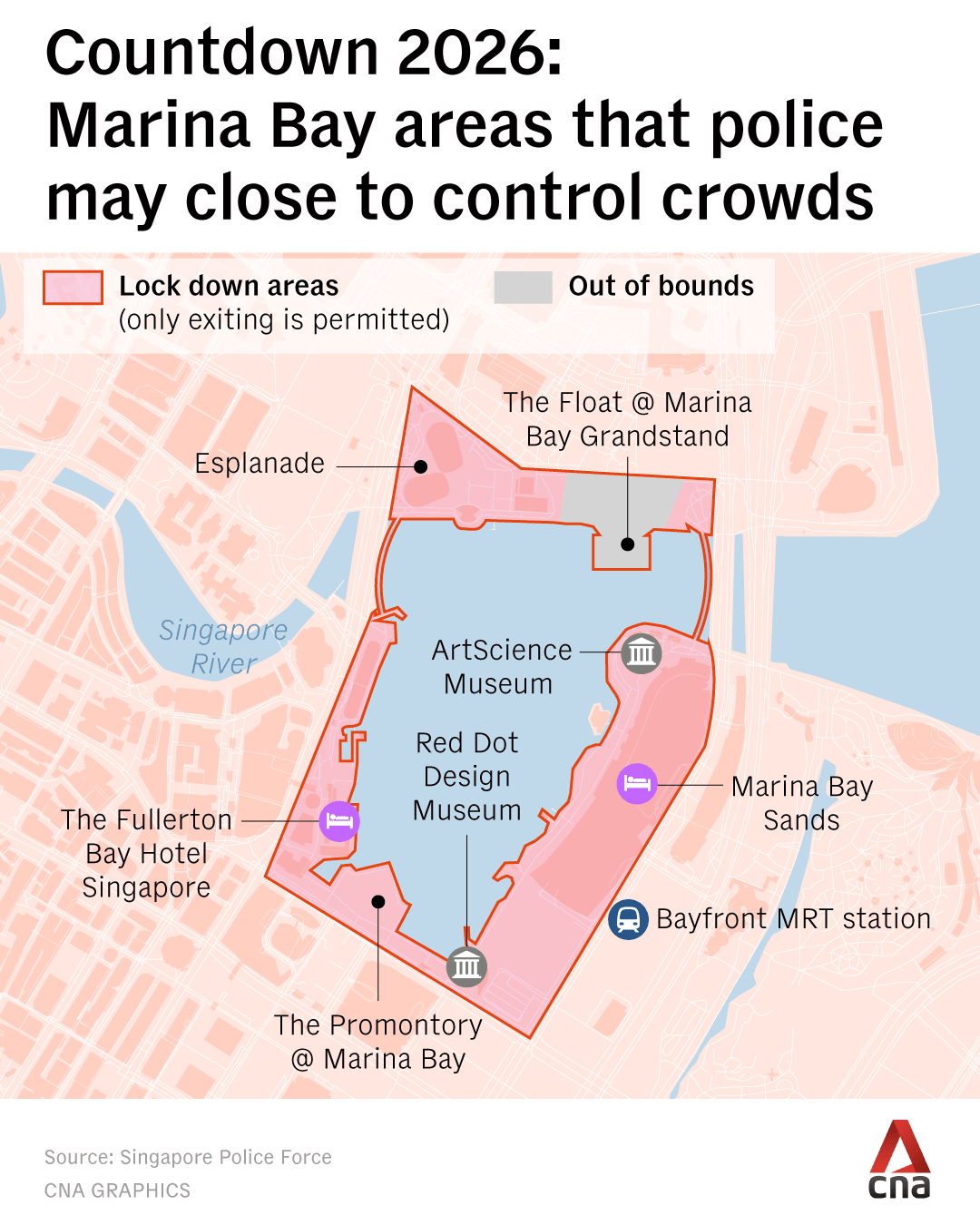 To prevent overcrowding, authorities will regulate the number of people entering The Promontory, One Fullerton, Merlion Park, Esplanade Park, Esplanade Waterfront Promenade, Marina Bay Sands Waterfront Promenade, and other areas at Marina Bay.