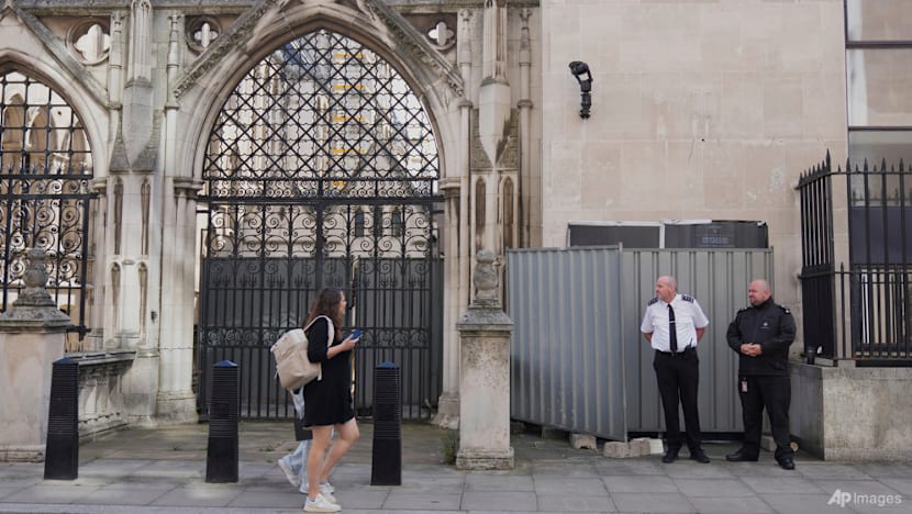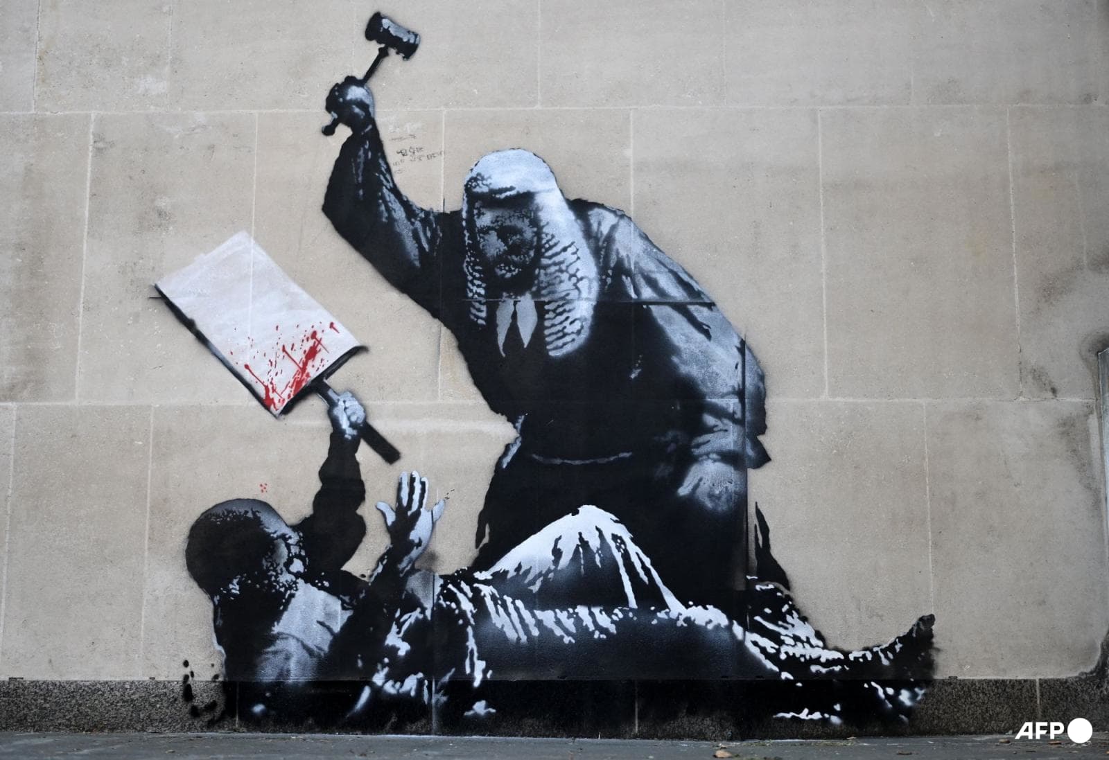 An artwork by street artist Banksy, depicting a judge using a gavel to beat a protester using a placard as protection, is pictured on a exterior wall of the The Royal Courts of Justice, Britain's High Court, in London on Sep 9, 2025. (File photo: AFP/Justin Tallis)