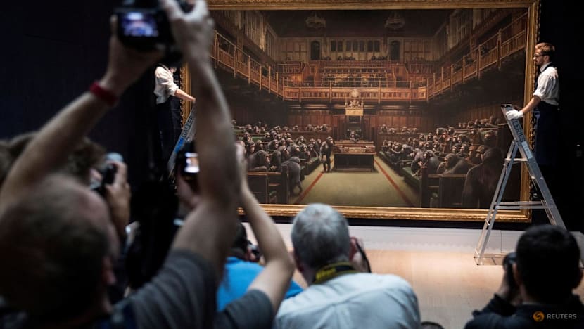 Members of the media take photos as Sotheby's staff pose for a photograph with Banksy's Devolved Parliament in London on Sep 27, 2019. (File photo: Reuters/Simon Dawson)