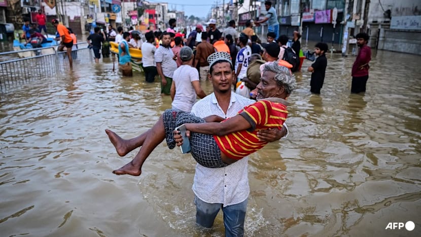 A youth carries an elderly man as they wade through a flooded street after heavy rainfall in Wellampitiya on the outskirts of Colombo on Nov 30, 2025. (Photo: AFP/Ishara S Kodikara)