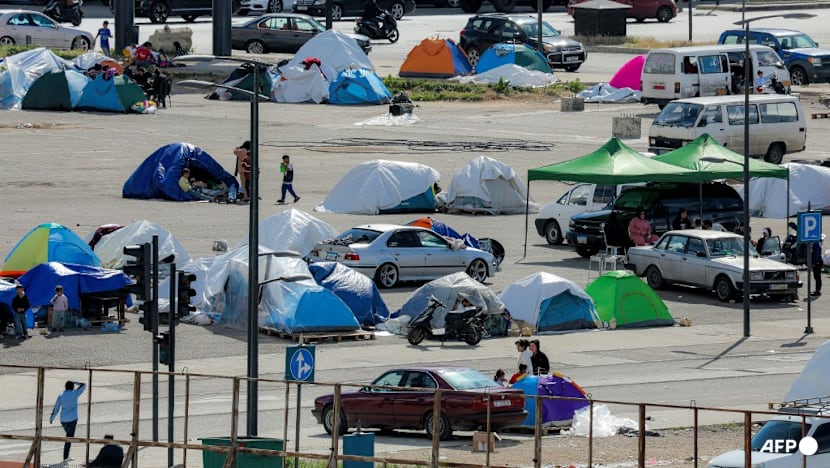 Makeshift tent encampments for people displaced from their homes by war are pictured at a parking area near Beirut's waterfront on March 25, 2026. (Photo: AFP/Joseph Eid)