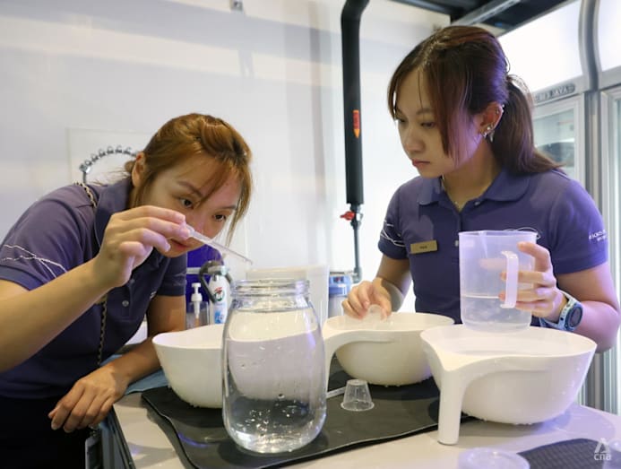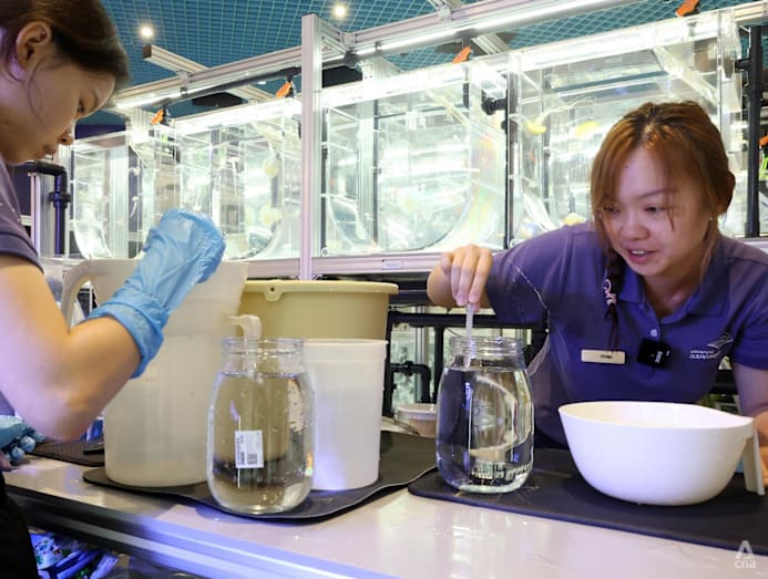 Ms Vivian Cavan (right), a lead animal care specialist at the Singapore Oceanarium, transferring ephyrae of sea jellies from a bowl and to a mason jar of clean water on Mar 3, 2026. Water change for sea jellies’ ephyrae is part of the sea jellies animal care team’s daily routine. (Photo: CNA/Ooi Boon Keong)