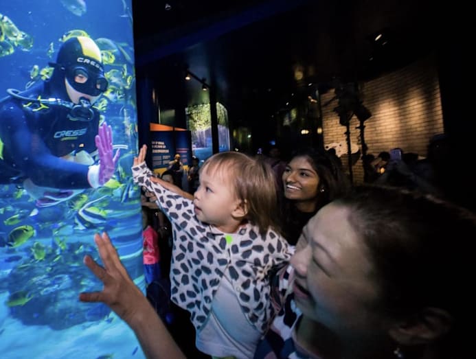 Ms Vivian Cavan diving in 2016 to surprise her daughter, held by her mother, at the Singapore Oceanarium, formerly known as the SEA Aquarium. (Photo: Vivian Cavan)
