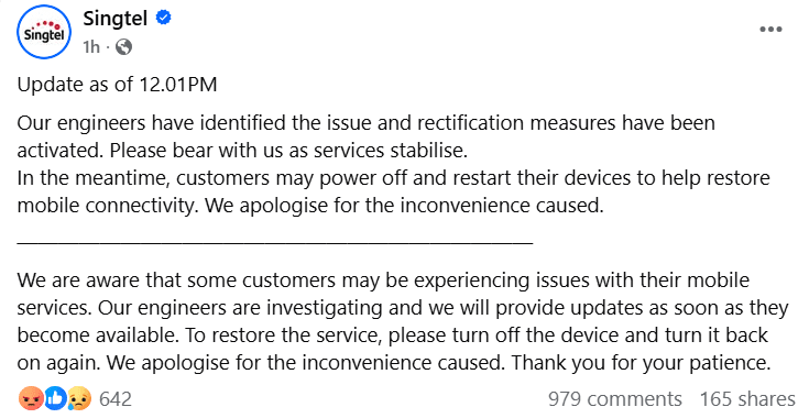 "Please bear with us as services stabilise. In the meantime, customers may power off and restart their devices to help restore mobile connectivity. We apologise for the inconvenience caused," it said at about 12pm.