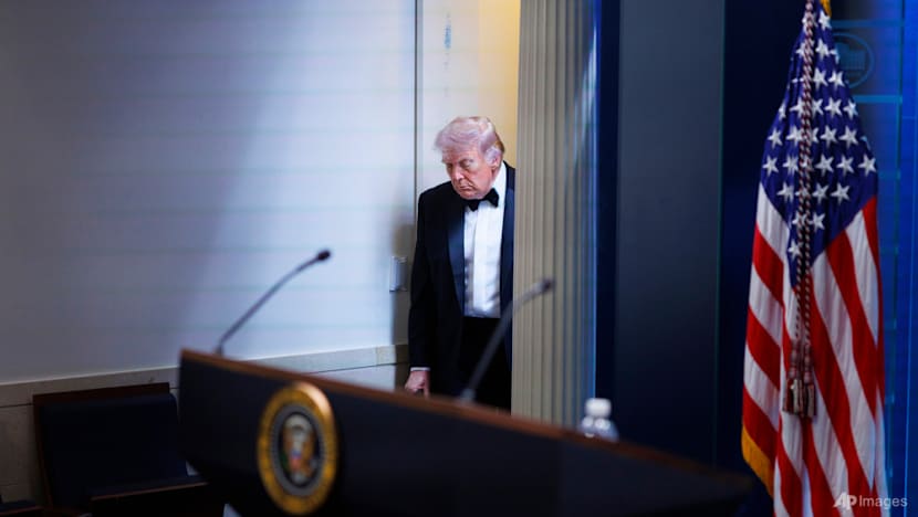 President Donald Trump arrives at the James Brady Press Briefing Room at the White House after a shooting incident outside the ballroom at the annual White House Correspondents' Association Dinner in Washington, Apr 25, 2026. (PHOTO: AP/Tom Brenner)