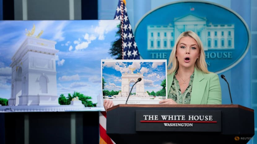 White House Press Secretary Karoline Leavitt holds an artist's rendering of US President Donald Trump's proposed "Independence Arch" during a press briefing in the James S Brady Press Briefing Room at the White House in Washington, DC, US, on Apr 15, 2026. (Photo: Reuters/Evan Vucci)