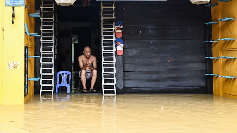 A man sits at the entrance of a flooded shop following heavy rains in Hoi An on Oct 30, 2025. (Photo: AFP/Nhac Nguyen)