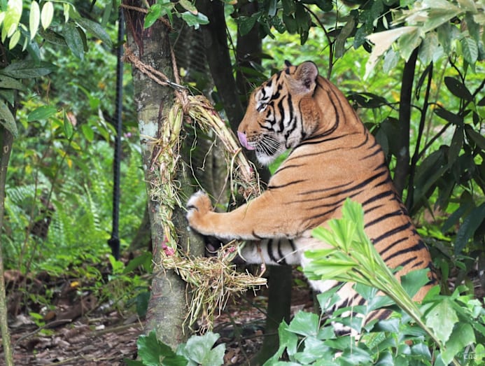 “This kind of enrichment engages our tigers in a more stimulating way, and also encourages them to use different muscle groups, including their hind and fore legs,” said keeper Julette Tay.