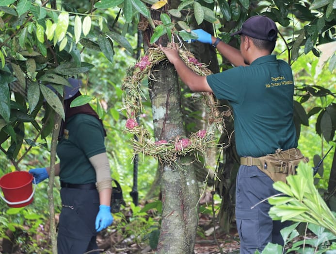 An eight-metre-tall Tree of Life at Mandai Wildlife West, adorned with ornaments representing threatened species cared for in the wildlife parks, including the Negros bleeding-heart pigeon, Philippine spotted deer and Sunda pangolin. (Photo: CNA/Joyee Koo)