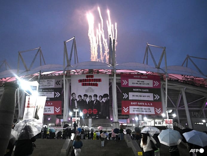 Tens of thousands of fans filled a rainswept stadium in South Korea on Thursday (Apr 9) to watch BTS kick off their world tour, as the K-pop megastars ride the momentum of a chart-topping comeback album and a landmark performance in the heart of Seoul.