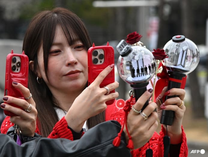 Fans take pictures of BTS light sticks as they arrive at a stadium where the group will perform in Goyang on Apr 9, 2026. (Photo: Jung Yeon-je / AFP)
