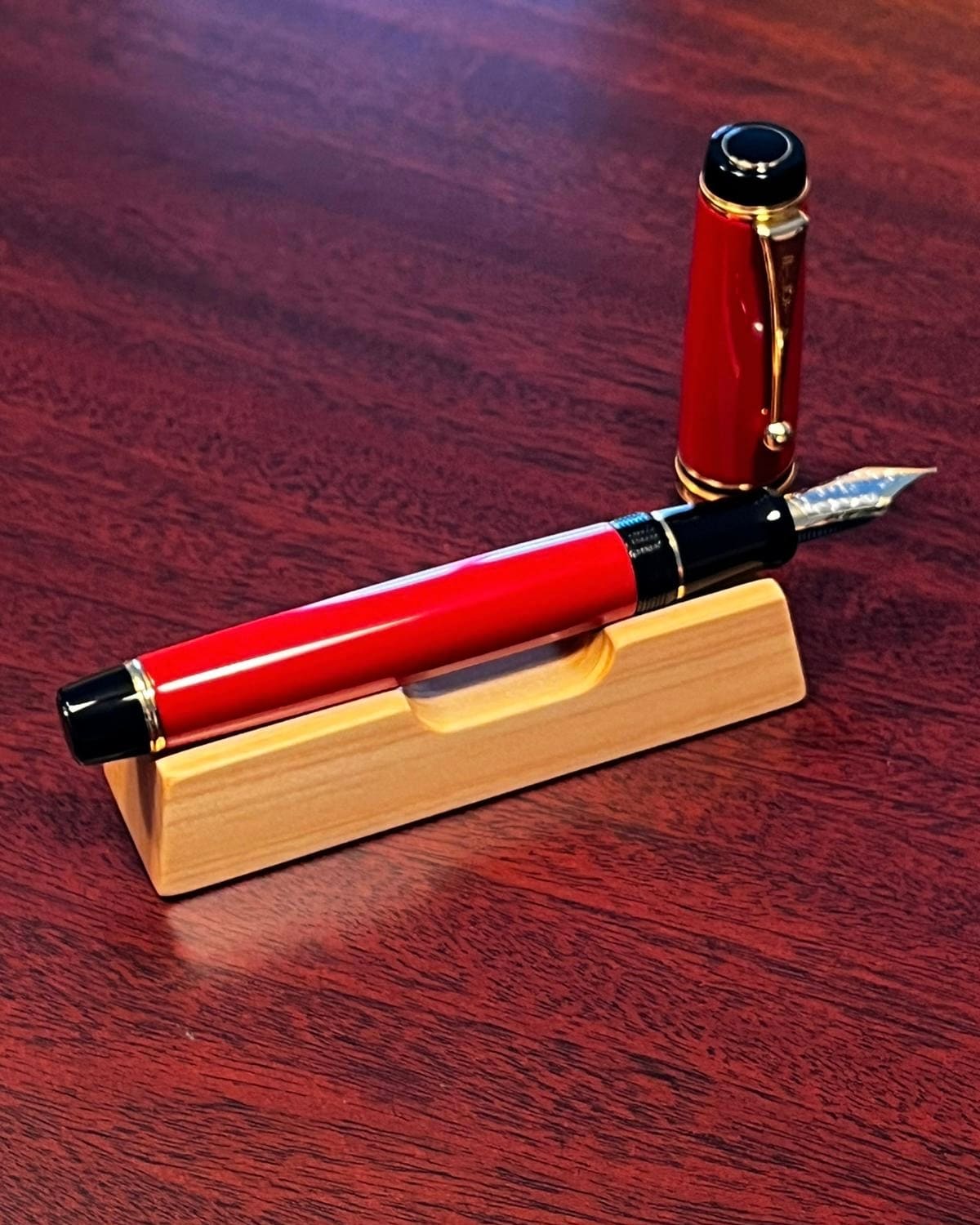 He takes out another pen: A Pilot Custom Urushi Red Fountain Pen (Size 30 Nib) made of resin and plastic with a broader body.
