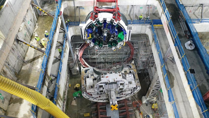 Lowering of the tunnel boring machine parts into the launch shaft for assembly. (Photo: Changi Airport Group)