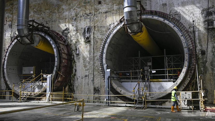A worker seen next to a pair of automated people mover tunnels, which will be used to link passengers between terminals, below the ground at Changi Airport's Terminal 5 construction site, Dec 30, 2025. (Photo: CNA/Wallace Woon)