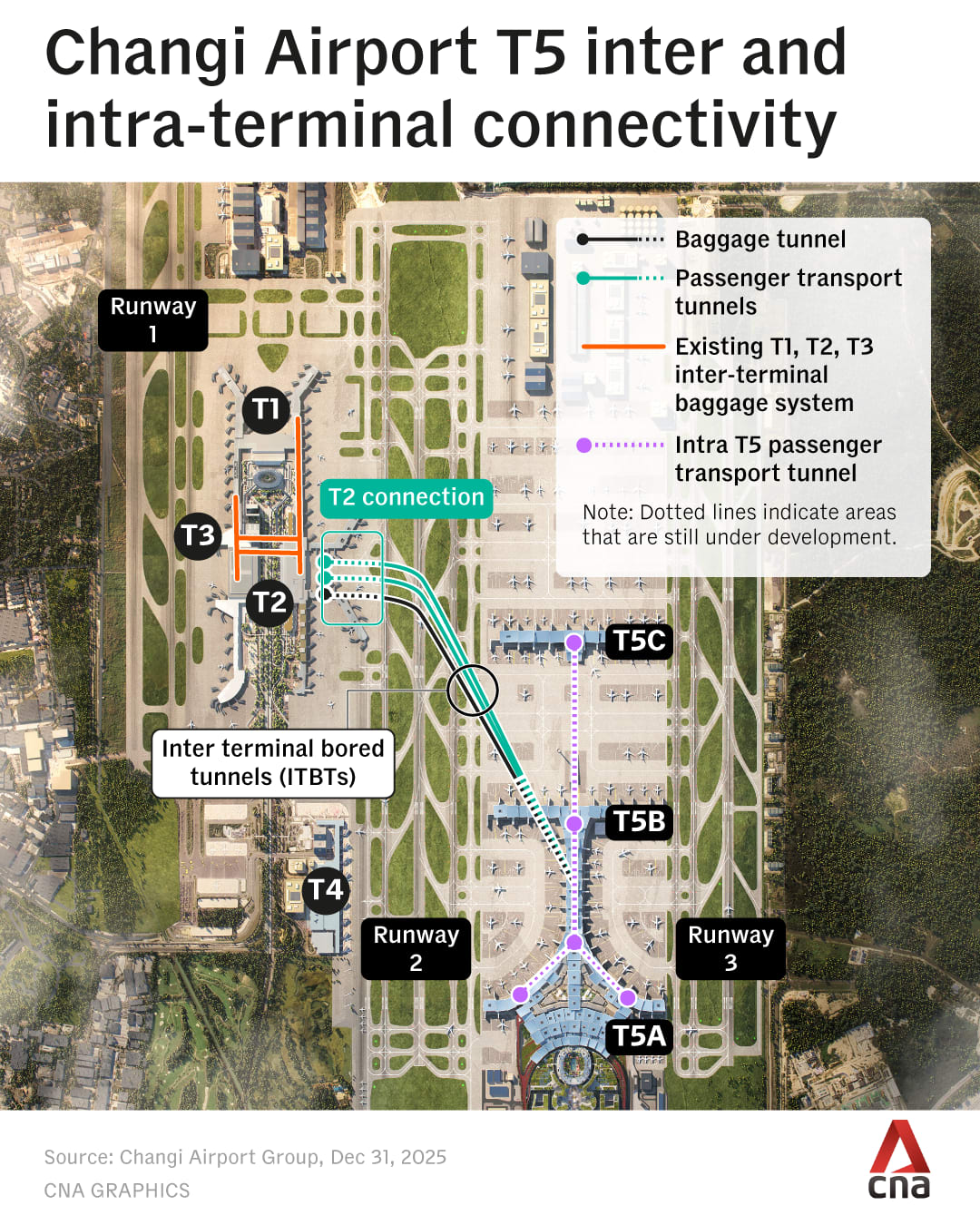 SINGAPORE: Major tunnelling works that allow passengers and baggage to travel between Terminal 2 and Terminal 5 at Changi Airport have been completed, Changi Airport Group said on Wednesday (Dec 31) as it gave more details of the engineering feat.