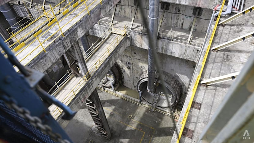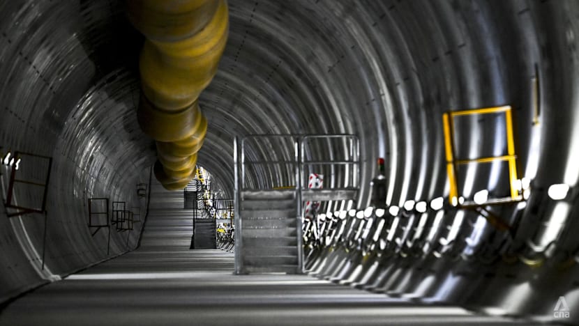 A view of the opening of an automated people mover tunnel, which will be used to link passengers between terminals, 28 metres below the ground at Changi Airport's Terminal 5 construction site, Dec 30, 2025. (Photo: CNA/Wallace Woon)