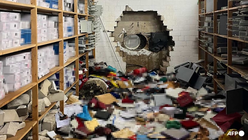 A giant hole in a wall of the bank vault of a Sparkasse bank branch on Dec 29, 2025, after unknown perpetrator(s) broke in during the Christmas holidays. (Photo: Police Gelsenkirchen via AFP)